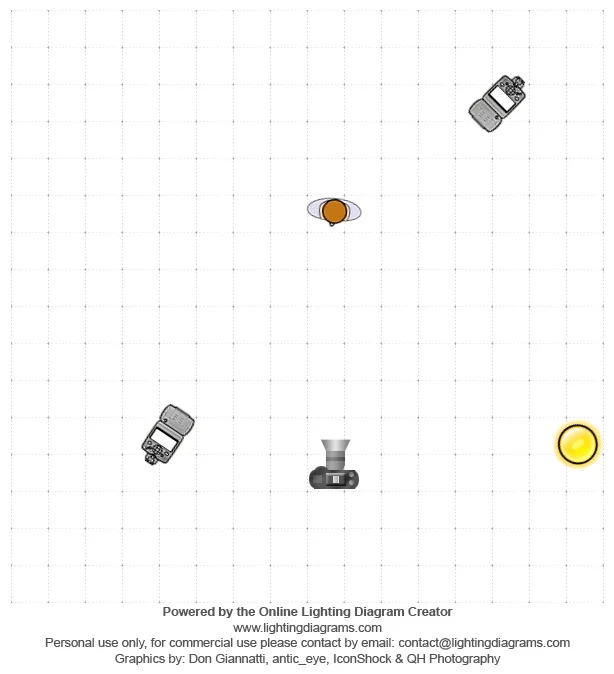 In this first set up, we used two speed lights—one at camera left about 45 degrees from the subject and the other camera right about 45 degrees from the subject. The power for the speed light camera left was at 1/4 at 35mm. The speed light camera right was 1/16 at 105mm.